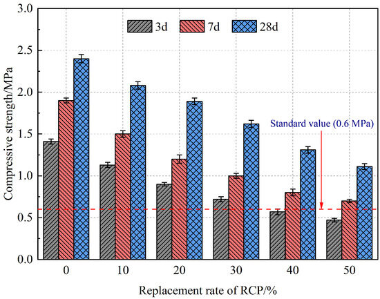 Figure 8 shows the influence of RCP content on the compressive strength of the AASR foamed concrete. With the increase in the curing age, the compressive strength of the AASR foamed concrete increased, especially in the later ages. At all ages, the compressive strength of foamed concrete decreases with the increase in the RCP content. When 50% RCP is added, the 3 d, 7 d, and 28 d compressive strength of the AASR foamed concrete is 0.47 MPa, 0.70 MPa, and 1.11 MPa, respectively, which is 66.7%, 63.2%, and 53.8% lower than that of AASR0. This is mainly because as the content of RCP increases, its disadvantages of having more internal pores, poor particle shape, and low activity gradually become prominent. Moreover, the more the content is added, the more water is adsorbed, which is not conducive to the hydration reaction; secondly, RCP replaces mineral powder. Because the activity of RCP is lower than that of slag, the compressive strength of the AASR foamed concrete decreases [41]. Although the addition of RCP reduces the compressive strength of the AASR foamed concrete, the 28 d compressive strength of AASR foamed concrete under all RCP replacement rates still meets the standard value (0.6 MPa).