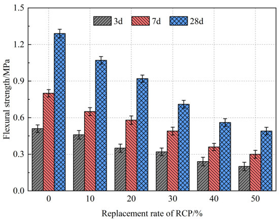 The influence of the RCP content on the flexural strength of the alkali-activated foamed concrete is shown in Figure 9. With the increase in the RCP content, the flexural strength of AASR foamed concrete decreases gradually, which is consistent with the change rule of compressive strength. When 50% RCP is added, the 3 d, 7 d, and 28 d flexural strength of the AASR50 foamed concrete is 0.2 MPa, 0.3 MPa, and 0.49 MPa, respectively, which is 64.2%, 63.2%, and 66.7% lower than that of the AASR0.