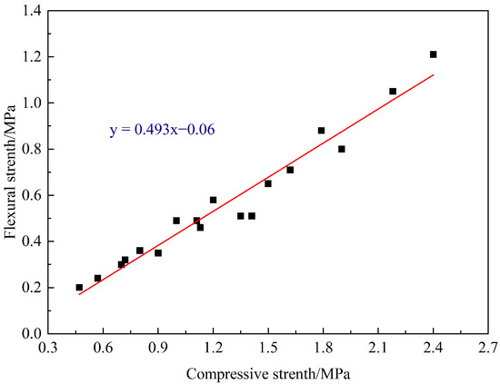 The relationship between the compressive strength (ft) and flexural strength (ff) of the foamed concrete is complex, which is affected by the composition, density, pore structure, curing conditions, and curing age of the foamed concrete. Generally, there is a positive correlation between the compressive strength and the flexural strength of the foamed concrete. According to the test results, the relationship between the AASR foamed concrete flexural strength and the cube compressive strength is shown in Figure 10. Through regression, the relationship formula can be obtained as follows: