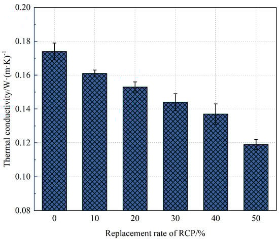 Figure 11 shows the influence of different RCP contents on the thermal conductivity of the AASR foamed concrete. It can be seen from Figure 11 that the addition of RCP can effectively reduce the thermal conductivity of the AASR foamed concrete. In particular, the larger the amount of RCP, the more obvious the downward trend is. When the amount of RCP is 50%, the thermal conductivity of the AASR foamed concrete is the lowest, 0.119 W/(m·K). This is because RCP has irregular particles and high-water absorption capacity compared with slag, which will cause damage to the slurry foamed liquid film, leading to the increase in irregular large holes in the specimen and a decrease in the pore structure compactness. With the increase in the RCP replacement rate, the porosity of AASR foamed concrete increases, which is more obvious. At this point, due to the reduction in the slag, the hydration products decrease, the proportion of stable internal and external solid structures decreases, the efficiency of heat conduction decreases, and the thermal conductivity decreases [40].