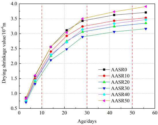 The drying shrinkage values of the AASR foamed concrete with different RCP contents are shown in Figure 12. It can be found that the drying shrinkage of the AASR foamed concrete is divided into three stages. The first stage is the slow growth stage (3–7 d). At this time, the internal water content of the structure is high, and the water is lost along the relatively large connecting pores and capillary pores. This situation will cause changes in the capillary tension and surface free energy of the AASR foamed concrete, making the specimen gradually shrink [42]; simultaneously, at this stage, the substitution rates of RCP have no significant effect on the dry shrinkage of the AASR foamed concrete. When the RCP substitution rates are 0%, 10%, 20%, 30%, 40%, and 50%, the 7 d dry shrinkage values of the samples are 1.584, 1.492, 1.404, 1.322, 1.444, and 1.607 × 10−6 m, respectively. The second stage is the rapid growth stage (7–28 d); at this time, the water content of the specimen is largely lost under the dry environment and internal hydration, and the nanopores in the AASR foamed concrete lose water seriously and the gel begins to densify. The combined effects of the two led to the sharp shrinkage of the specimen volume [43]; in addition, with the increase in the RCP content, the drying shrinkage of the foamed concrete decreases first and then increases. The RCP content is 10%, 20%, 30%, and 40%, and the 28 d dry shrinkage values of the samples are 3.429, 3.242, 3.062, 2.893, 3.145 and 3.503 × 10−6 m, respectively, and the drying shrinkage performance of the AASR foamed concrete is the best under the 30% replacement rate of RCP. This is because as the substitution rate of RCP for mineral powder increases, the activity of RCP is low, the hydration reaction is slow, and the hydration products produced by hydration are reduced, resulting in smaller shrinkage [44]. In the third stage, after 28 d, the dry shrinkage value of the specimen slowly increases and tends to stabilize. Compared with the 28 d dry shrinkage values, the 42 d shrinkage values for AASR0, AASR20, AASR30, AASR40, and AASR50 increased by 5.86%, 5.91%, 5.88%, 6.17%, and 6.59%, respectively. Compared with the 42 d shrinkage values, the 56 d shrinkage values for AASR0, AASR20, AASR30, AASR40, and AASR50 increased by 2.32%, 2.86%, 3.39%, 3.33%, and 4.69%, respectively.