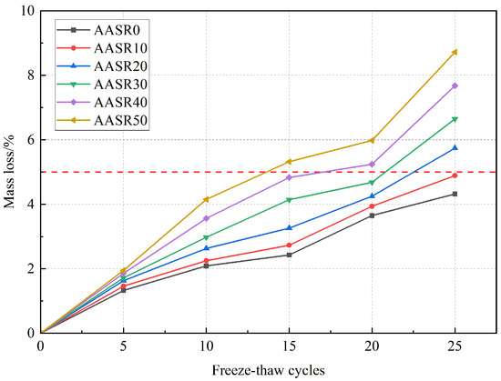 The mass loss rate is one of the important indicators reflecting the frost resistance of cement-based materials. Figure 13 shows that when the number of freeze–thaw cycles is low, the influence of the dosage on the loss rate is relatively small. And when the number of freeze–thaw cycles is five, the mass loss rate of AASR0 is the lowest at 1.33%. With the increase in the freeze–thaw cycles, the mass loss rate of the AASR foamed concrete under different RCP content increases, and with the increase in the RCP content, the increase is larger. This is because with the increase in the RCP content, the water absorption rate of the AASR foamed concrete increases and the softening coefficient decreases, which makes the specimens with higher RCP content subject to greater frost heave stress and more serious surface damage under the condition of multiple freeze–thaw cycles. The mass loss rates of AASR0, AASR10, AASR20, AASR30, AASR40, and AASR50 are 4.32%, 4.89%, 5.74%, 6.65%, 7.68%, and 8.72%, respectively, after 25 freeze–thaw cycles. According to JGJ/T 341-2014 [31], when the mass loss rate of the AASR foamed concrete with 20–50% RCP content reaches 5% after 25 freeze–thaw cycles, it can be considered that it has been damaged by freeze–thaw.