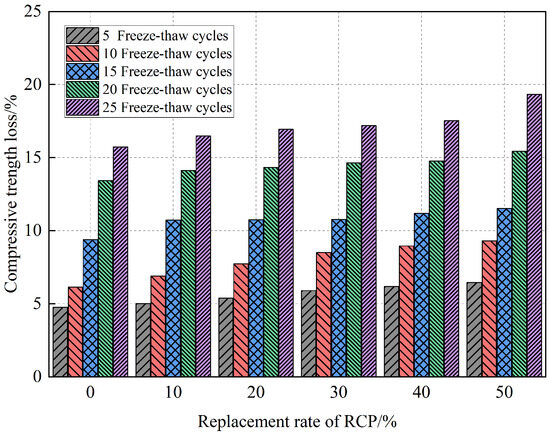 Figure 14 shows the influence of the RCP content on the strength loss rate of AASR foamed concrete under different freeze–thaw cycles. It can be seen from Figure 14 that when the RCP content is unchanged, the strength loss rate of the AASR foamed concrete increases with the increase in the freeze–thaw cycles; when the number of freeze–thaw cycles is constant, the strength loss rate increases with the increase in the RCP content and shows an increasing trend under different freeze–thaw cycles. When the RCP content is 50%, the highest strength loss rate is 19.88% after 25 freeze–thaw cycles. This is because the activity of RCP is low, and its incorporation will reduce the strength of the AASR foamed concrete, and the ability to resist the frost heaving stress caused by freezing and thawing will become weak and vulnerable to damage. In addition, the incorporation of RCP will increase the water absorption in the AASR foamed concrete, which will subject it to greater frost heave stress during a freeze–thaw cycle, thus causing more serious internal damage [45].