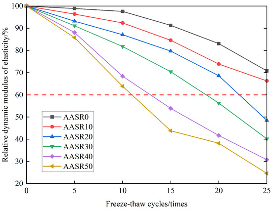 Figure 15 shows the influence of freeze–thaw cycles on the relative dynamic elastic modulus of the AASR foamed concrete with different RCP contents. It can be seen from Figure 15 that with the increase in the freeze–thaw cycles, the relative dynamic elastic modulus of the AASR foamed concrete gradually decreases, which indicates that freeze–thaw will aggravate the internal damage of the AASR foamed concrete, because the expansion of water freezing in the pores will increase the water pressure in the pores until the tensile strength is reached and the internal pores of the test block freeze and crack. Under the same freeze–thaw cycles, the relative dynamic elastic modulus of AASR foamed concrete decreases with the increase in the RCP content. The relative dynamic elastic modulus of AASR0, AASR10, AASR20, AASR30, AASR40, and AASR50 are 70.8%, 66.3%, 48.5%, 40.2%, 30.8%, and 24.64%, respectively, after 25 freeze–thaw cycles. According to JGJ/T 341-2014 [31], the relative dynamic elastic modulus of the AASR foamed concrete with 20–50% RCP content has decreased to less than 60% after 25 freeze–thaw cycles, which can be regarded as having been damaged by freeze–thaw, which is consistent with the result of mass loss.