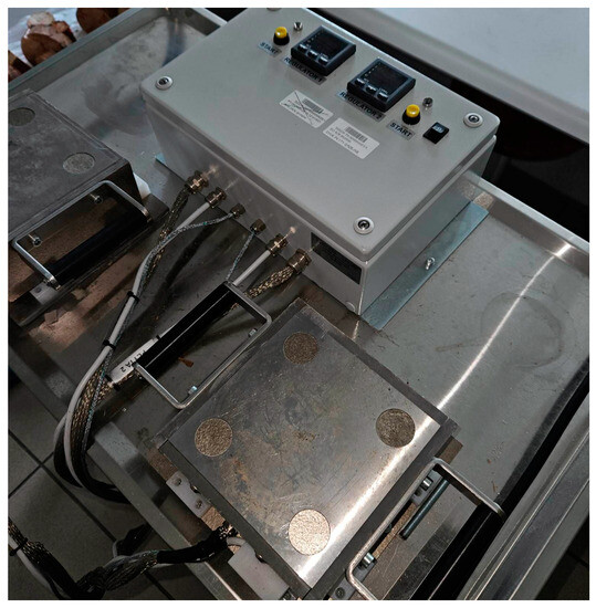 In order to carry out the planned tests, it was necessary to use a heating plate. In order to perform the experiments, an appropriate test measuring stand was constructed to prepare the specimens for future testing. In the first step, the prepared raw material sample before compacting was pretreated in the oven heated up to 230 °C for 10 min. The second step was to compact the prepared mixture between the heating plates at the desired temperature after pretreatment. It was necessary to maintain a constant temperature provided by the controller for the heater during the compacting process. The required temperature in this case obtained at 160 °C and the necessary time obtain in about 10 min. The compaction heating plates are presented in Figure 1.