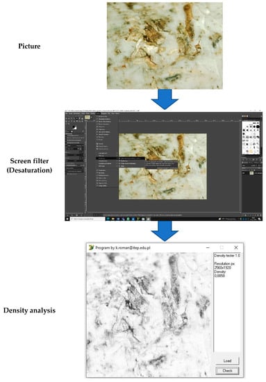The information about color saturation in the image is reduced when it is desaturated to the grayscale mode by reducing its saturation level [26]. Grayscale reduction is the process of removing the hue and saturation information from the pixels of a picture. The information saved with the image is only a measure of the luminance of a particular image. In order to further analyze an image, a program with specific instructions is used to count the intensity of grayscale pixels. Computer programs prepare an algorithm to count and separate pixels based on grayscale. The combination of the obtained data allows the estimation of the amount of black-to-white in an image.