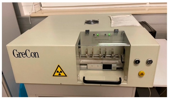 In order to perform the biocomposite structure tests, the density profile analysis was one of the most crucial research elements. The analysis of the biocomposite density profile was tested in two different PLA mixture proportions. The analysis allows an understanding of how the percentage of PLA in the value of 25 and 50% affects the structure and density of the material at different test points of the sample. The test allows determining the size of changes in the biocomposite structure depending on the intensity of the assumed percentage of PLA. According to the methodology, the measured samples required technological preparation. The sample profile must be in a dimension not exceeding 500 × 500 mm in width and height. The dimensional range ensures the proper measurement in GreCon measurement equipment. The prepared sample was measured with a caliper, controlling the dimensions of width, height, and thickness in accordance with the measurement equipment recommendations. The density profile of the prepared mixtures was measured at a speed 0.05 mm⋅s−1. The GreCon measurement equipment for the density profile test is presented in Figure 4.