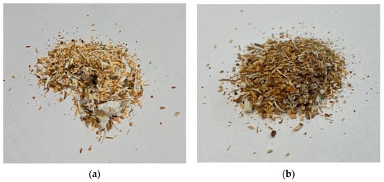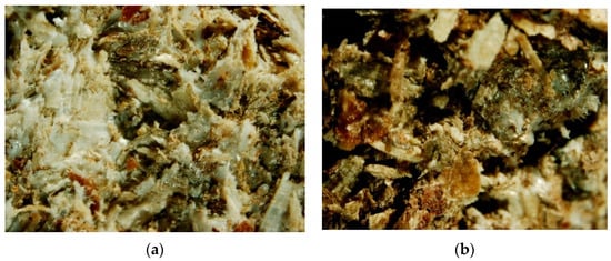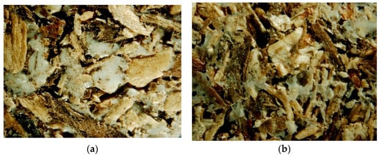 The PLA biocomposite samples in interdisciplinary research are analyzed to understand their composition, structure, and properties. In order to obtain images with a highly focused zoom for further desaturation activities, the prepared biocomposite samples were examined under the microscope. The biocomposite material was made by combining shredded pine wood (Pinus sylvestris L.) with 25 and 50% PLA in mass participation. The samples were analyzed in the front view of the profile. According to the PLA content in the samples, the structure varied according to their initial composition. The front view of the profile samples of 50% and 25% PLA shares is presented in Figure 6.