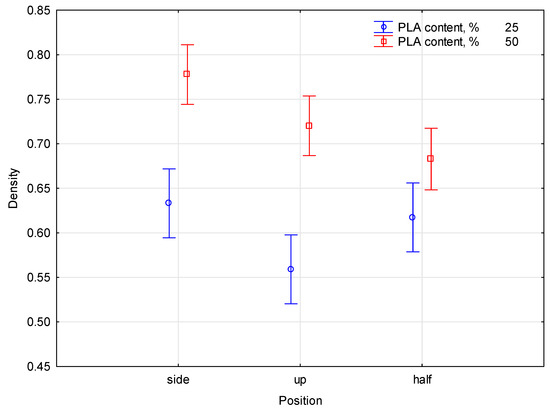 For samples containing 50% PLA, the following density values were found. Top position: 0.720 (marked as d). Halfway position: 0.683 (marked as c, d). Side position: 0.777 (marked as e). For samples containing 25% PLA, the following density values were found. Top position: 0.559 (marked as a). Halfway position: 0.617 (marked as b). Side position: 0.633 (marked as b, c). Values marked with the letters a, b, c, d indicate belonging to homogeneous groups. On the basis of the statistical analysis performed for the density of the samples, homogeneous groups were determined in which the samples had similar density values.
