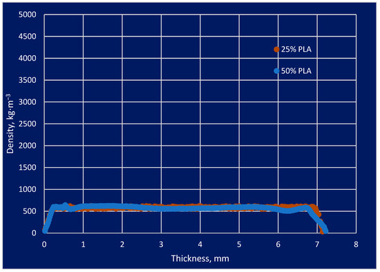 The biocomposite density profile samples with 50 and 25% PLA content.