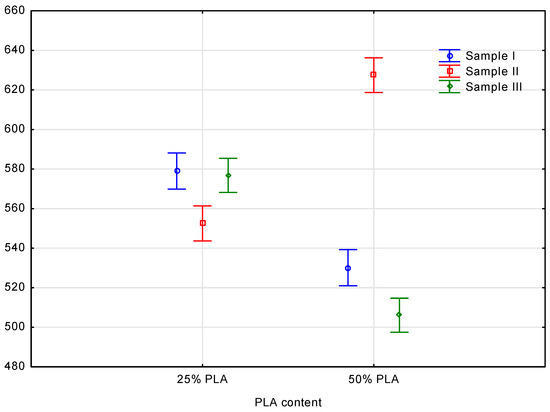 These conclusions suggest that the mixture of raw materials affects the density of the biocomposite, and that different sample positions and PLA content may lead to differences in density. The division into homogeneous groups enables a better understanding of the interrelationships between the composition of raw materials and the density of the biocomposite. In light of statistical analysis, the difference between PLA content percentages of 50 and 25% was possible. There was a significant impact on the factor defining color density from grayscale tones as a result of this change. In post hoc statistical analyses, it was evident that the measured parameters differed significantly from one another. The decomposition of effective hypotheses created interaction effects where vertical bars meant 0.95. An analysis of the results showed that the p-value was equal to 0.0244, making the result significant. The empirical statistic for the study was F(2, 77) = 3.8962. This shows a significant difference in the biocomposite material. The values of the results for individual materials, i.e., for 25% and 50%, differed on average by 0.1. This shows that the material has become denser.