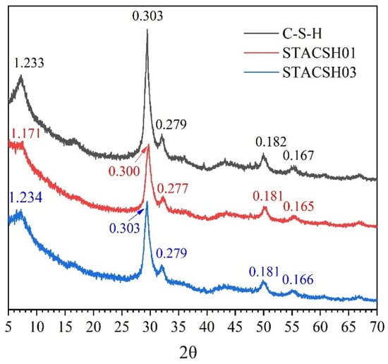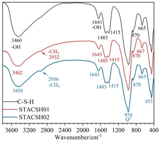 Figure 2 shows the FTIR analysis of pregelatinized starch-modifying C-S-H particles (C-S-H, STACSH01, and STACSH03 samples). In Figure 2, the C-S-H, STACSH01 and STACSH03 samples have bands at around 665 cm−1 due to Si-O-Si bending vibrations. The band at 974 cm−1 is assigned to the Si-O stretching vibrations of Q2 tetrahedra. The bands at around 1640 cm−1 and 3460 cm−1 belong to stretching vibrations of -OH groups in H2O or hydroxyls. The group of bands near 447 cm−1 belong to the deformation of silicate tetrahedra. In the STACSH01 and STACSH03 samples, the 2932 cm−1 and 2936 cm−1 bands correspond to methyl groups (-CH3) [23,39,42]. It can be clearly observed that, with increasing pregelatinized starch concentration, the absorption of -CH3 bonds increases gradually. There are no new chemical bonds of Si-O-R (R represent other groups) existing in the STACSH01 and STACSH03 samples, which demonstrates that pregelatinized starch may absorb on the surface of nanoscale C-S-H units. Other evidence for this absorption is the shifting of -OH bands at 1643 cm−1, 3462 cm−1 and 3458 cm−1 which is due to hydrogen bonding. Krautwurst [43] pointed out that C-S-H is formed by two steps that follow the non-classical crystallization theory; that is, C-S-H precursor forms firstly and then evolves into crystal units. Zhu [23] described a mixture of PDMS and C-S-H unit nanostructure, where PDMS deposited in the void space left by aggregates of nanocrystalline C-S-H. XRD analysis shows that pregelatinized starch changes the nanostructure of C-S-H units. FTIR shows this process does not form the new chemical bonds of Si-O-R but a physical action. In this research, pregelatinized starch may also distort the aggregates of C-S-H units during the formation of C-S-H.