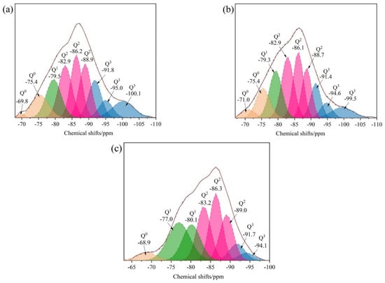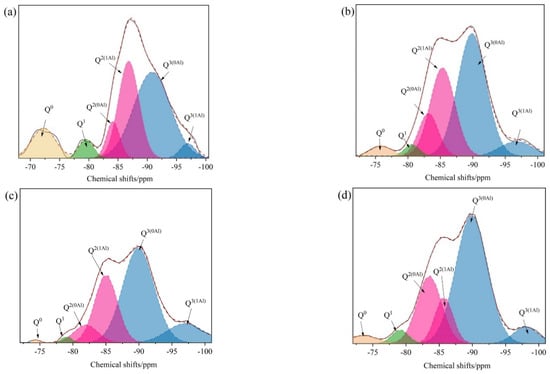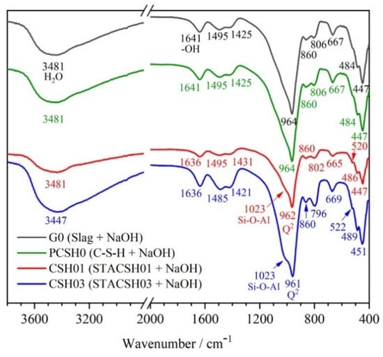 Figure 5 shows the FTIR spectrum of GGBS modified by pregelatinized starch/C-S-H additives which were cured for 3 d. In Figure 2, the bands at about 667 cm−1 and 964 cm−1 belong to Q2 tetrahedra. The bands at around 1640 cm−1 and 3480 cm−1 belongs to -OH groups in H2O or hydroxyls. It is noteworthy that bands at about 520 cm−1, 800 cm−1 and 1023 cm−1, which represent Al-O-Al, Si-O-Al and Si-O-Al bonds in C-(A)-S-H, respectively [38], appeared in samples with pregelatinized starch/C-S-H additives samples CSH01 and CSH03. In actuality, those Al-O-Al and Si-O-Al bonds also exist in the G0 and PCSH0 sample in our research. The failed detection of 520 cm−1 and 1023 cm−1 signals was due to their low content, and the supplementary information was obtained by NMR below. The FTIR results demonstrated silicate chain tailoring of GGBS by addition of pregelatinized starch-modified C-S-H particles. Since the performance is crucial relative to the material’s nanostructure, the C-A-S-H nanostructure change dominates the strength of GGBS at the molecular level. In order to obtained the detail of silicate chains, a NMR spectrometry analysis was conducted below.