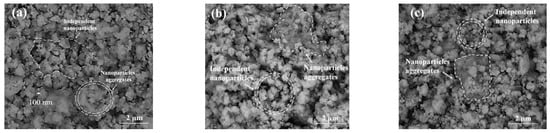 Figure 4a shows the microtopography of C-S-H particles. Figure 4b shows microscopic topographical views of STACSH01 samples. Figure 4c shows microscopic topographical views of STACSH03 samples. It was clearly observed that C-S-H is made up of aggregates of particles with the sizes ranging from about 100 nm to around 1000 nm. Scholars [23,33] have pointed out that polymers such as PVA, polyaniline and PDMS change the microscopic morphology of C-S-H to a cauliflower-like structure. In Figure 4b,c, the STACSH01 and STACSH03 samples are also made up of aggregates of particles with similar sizes to the C-S-H samples. There are two different regions existing in the microtopography of pregelatinized starch-modified C-S-H particles. One is a region consisting of around 300~500 nm independent nanoparticles and the other is a compact nanoparticle aggregate region. The observed phases existing between the adjacent particles are used for differentiating those two regions. And those two regions can also be observed in Figure 4a. This indicates pregelatinized starch does not affect the microtopography of C-S-H, which is due to physical action between pregelatinized starch and C-S-H units. Pregelatinized starch is considered to dissolve in water by destroying the double helix structure of starch. According to the XRD, FTIR and NMR results, the unfolded molecular chain absorbs on the surface of C-S-H particles of various sizes. The unchanged microtopography before and after modification indicates that pregelatinized starch participates in the stacking of C-S-H but does not form continuous polymer films. Pregelatinized starch may play a role of adhesion among the C-S-H particles at nanoscale.