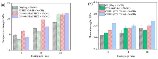 Figure 7 gives the compressive and flexural strength development of GGBS by addition of pregelatinized starch/C-S-H particles. In Figure 7, the early strength of GGBS samples was cured for 3 d. In order to verify that the early strength was not attenuated, the samples cured for 14 d and 28 d were also prepared. It is observed in Figure 7a that there is evident enhancement of early compressive strength by addition of STACSH01 particles which occupy 0.88% of GGBS powders by mass. Compared with the G0 sample, the enhanced compressive strength of the CSH01 samples is 9.52% for 3 d curing, 16.6% for 14 d curing and 12.7% for 28 d curing. Compared with the G0 samples, the addition of C-S-H and STACSH03 particles decreases the compressive strength for 3 d and 14 d curing. This demonstrates the early enhancing action is related to the optimized special structure of STACSH01 particles. It is noteworthy that the addition of C-S-H and STACSH03 enhanced the 28d compressive strength by 14.8%, which indicates potential enhancement of long age curing. In Figure 7b, the flexural strength is around the same as all samples cured for 3 d, 7 d and 28 d. The addition of modified C-S-H does not affect the flexural strength. In summary, the results demonstrate the pregelatinized starch-modifying C-S-H has a special effect on the early strength of GGBS hydrates. Since the strength of this system originates from C-A-S-H generation, the explanation for early performance of GGBS is related to the different Qn distribution of silicate chains. A similar phenomenon can be seen in nanosilica-enhanced GGBS hardened blocks, where nanosilica increases the 28 d compressive strength by 8.3–19.22% [46]. The nanocrystal seeds also play an enhancing role in compressive strength. In this research, the size of pregelatinized starch-modified C-S-H particles is at a micron scale; their actions may be different from the nanosilica seeds. That is, the nucleation active sites discussed above in modified C-S-H particles may play a significant role in early strength enhancement.