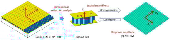 This section details the derivation of a VAM-based 2D-EPM for the SP-HHH. The 3D-FEM of the SP-HHH is reduced to constitutive modeling over the 3D unit cell (providing effective stiffness properties) and the 2D-EPM for global analysis. Figure 2 depicts the dimension reduction analysis of the SP-HHH, where and originate from the geometric center of the core cell and the panel, respectively. It is important to note that the unit cell depicted in Figure 2b requires a division of the small hexagons located at the upper and lower vertices to ensure its periodicity.