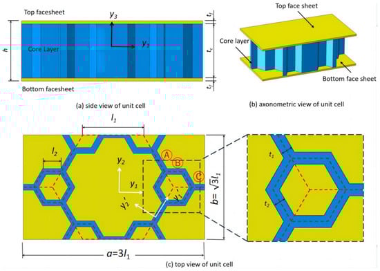 Unit cell of the SP-HHH and its parts for the strain energy integral ( and are side lengths of the microstructure and hexagon, respectively; and correspond to their respective wall thicknesses; and are the thicknesses of the facesheet and core layer, respectively).