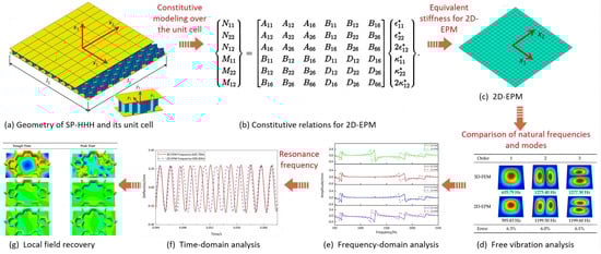 The flowchart illustrating the validation process for the dynamic analysis using the 2D-EPM is presented in Figure 4. The equivalent stiffness properties of the SP-HHH were determined through VAM-based homogenization of the unit cell. These properties were then input into the 2D-EPM for conducting free vibration analysis. Based on the obtained natural frequencies and modes, the frequency scanning range, as well as the positions for excitation and reception in the harmonic response analysis, was determined. Subsequently, by examining the maximum resonant responses at peak and trough times, local displacement and stress fields within the unit cell were obtained using recovery relationships. To evaluate the accuracy of the 2D-EPM, the natural frequencies, modes, frequency response function (FRF) curves, and displacement–time curves at the first resonance frequency were compared with those obtained from the 3D-FEM. This comparative analysis served as the foundation for predicting the fatigue life of the SP-HHH when subjected to periodic loads.