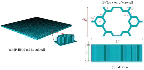 The three-dimensional model of the SP-HHH comprised 24 unit cells in the direction and 14 unit cells in the direction. The sandwich panel had uniform side lengths of 400 mm, and the geometric parameters of the unit cell were , and . The material used in the simulation was aluminum, with material parameters of , and .