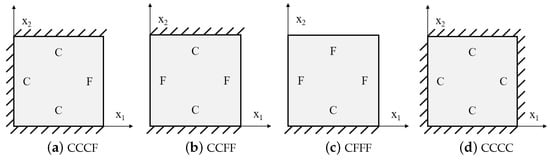 To assess the accuracy of the 2D-EPM in predicting the natural frequencies and modes of the SP-HHH, free vibration analyses were performed with both models using various boundary conditions (BCs), as illustrated in Figure 7. The BCs included a free boundary (denoted as F) and clamped boundary (denoted as C). The deviation between the results obtained from the 3D-FEM and 2D-EPM was quantified as the “Error”, which was calculated as