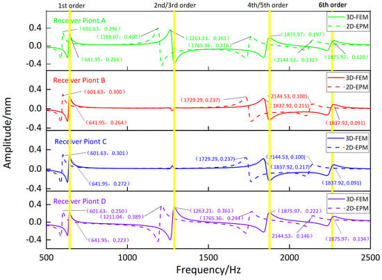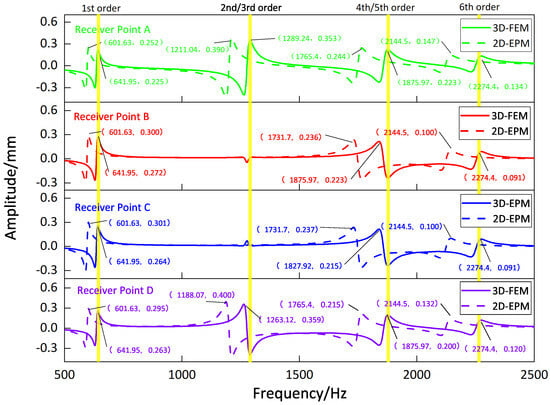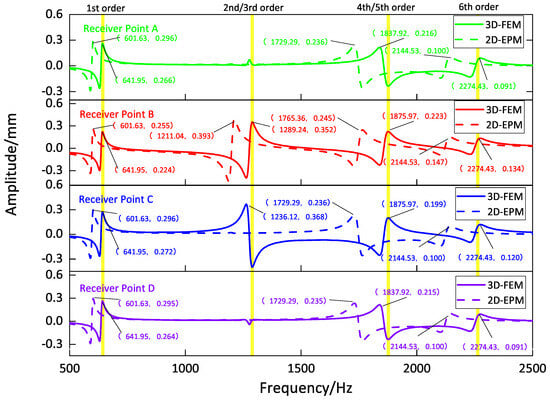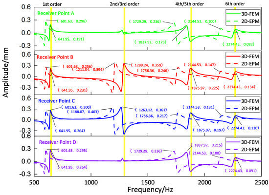 Figure 9, Figure 10, Figure 11 and Figure 12 compare the forced vibration responses in cases one to four predicted by the 3D-FEM and 2D-EPM, respectively. Frequency-domain analysis revealed distinctive peaks spanning from the fundamental frequency of 649 Hz to the sixth natural frequency of 2274 Hz, indicating a resonance phenomenon. Notably, the resonance peak associated with the first to the fourth natural frequencies was considerably larger than that corresponding to the fifth and sixth natural frequencies. The characteristics exhibited by the FRF curves were in good agreement with the aforementioned modal diagram under CCCC BCs. Firstly, the symmetry of the vibration response at each point corresponded to the symmetry observed in the modal diagram. For instance, in the modal diagram of the first mode, the receiving points exhibited identical displacements, leading to a high level of coherence in the FRF curve across these four points (with slightly larger amplitudes of excitation points). Similarly, the points situated on the diagonal of the fourth modal diagram displayed consistent displacement responses, causing convergence of the vibration responses of points A and D, as well as B and C, on the FRF curve. This pattern of symmetry extended to other modes as well. Secondly, owing to the close similarity between the second and third natural frequencies, the FRF curves displayed their superposition. The modes’ symmetry further contributed to this phenomenon, as points located on one diagonal effectively canceled each other out, resulting in minimal peaks, while points on the opposite diagonal overlapped, leading to larger peaks.