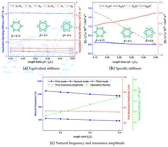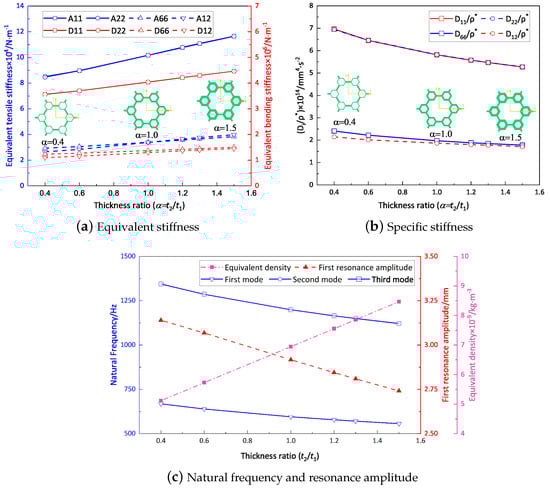 Figure 14a shows the variation curve for the equivalent stiffness with a thickness ratio of while the other parameters remain unchanged (). It is evident that the equivalent tensile and bending stiffness both increased gradually as the thickness ratio increased from 0.4 to 1.5. Figure 14b shows that the specific stiffness decreased with increasing thickness ratio. Furthermore, Figure 14c exhibits changes in natural frequencies and the first response amplitude with alterations in the thickness ratio. It is notable that the first three natural frequencies decreased gradually with increasing thickness ratio, accompanied by a gradual decrease in the first resonance amplitude. This decrease could be attributed to the increase in equivalent density, which was relatively greater than the resulting increase in equivalent stiffness due to the increase in the thickness ratio.