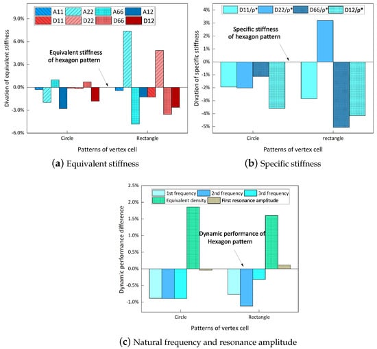 Figure 17 shows the effects of different vertex cell patterns on the dynamic characteristics of the SP-HHH. It reveals that the SP-HHH with hexagonal vertex cells displayed higher specific stiffness than the rectangular one (except ). Furthermore, both the specific stiffness and equivalent stiffness of the SP-HHH with circular vertex cells were inferior to those of the other two patterns. Figure 17c shows that the SP-HHHs with circular and rectangular vertex cells exhibited higher equivalent densities when compared to the one with hexagonal vertex cells, and the first three natural frequencies were smaller. However, the SP-HHH with circular vertex cells demonstrated a smaller first resonance amplitude than that the one with the hexagonal vertex cells. Hence, it can be concluded that the SP-HHH with hexagonal vertex cells has superior specific stiffness compared to those with circular and rectangular vertex cells, resulting in a more lightweight design and enhanced stiffness. Conversely, the SP-HHH with circular vertex cells exhibited a greater mass-to-stiffness ratio. As a result, it offers distinct advantages in terms of amplitude control.