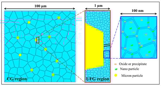 The nano-micron hybrid configuration is an effective design that combines two different sizes of reinforcements to synergistically improve both strength and toughness under load. Larger particles can withstand significant loads and accumulate strain energy, triggering recrystallization in the surrounding metal matrix [17,64,65,66]. On the other hand, smaller nanoparticles reduce the stress concentration in the GBAZs and IAZs around the larger particles, retarding phenomena such as recrystallization and grain growth (Figure 2) [3,67,68,69,70]. The uniform distribution of reinforcing elements in two different sizes is challenging in conventional fabrication processes, especially for nanocarbon materials such as carbon nanotubes and graphene, limiting the achievement of desired toughness and plasticity in nano/micron hybrid configurations [71,72,73,74,75].