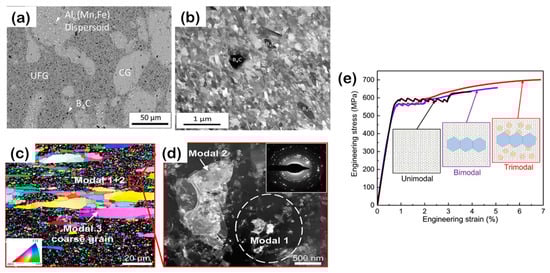Figure 4. (a) Enlarged view of the microstructure showing UFG matrix with B4C (dark particles) and CG regions with Al6 (Mn,Fe) dispersoids (bright particles); reprinted from [134], with permission from Springer; (b) STEM annular dark field image of the UFG matrix; reprinted from [134], with permission from Springer (c) IPF map showing trimodal grain structures; reprinted from [126], with permission from Elsevier; (d) TEM dark-field image of modal 1 and 2 grain structures, insert is the corresponding SAED pattern; reprinted from [126], with permission from Elsevier; (e) Representative engineering stress–strain curves of CNT/Al–Cu–Mg composites with different grain structures, [131].