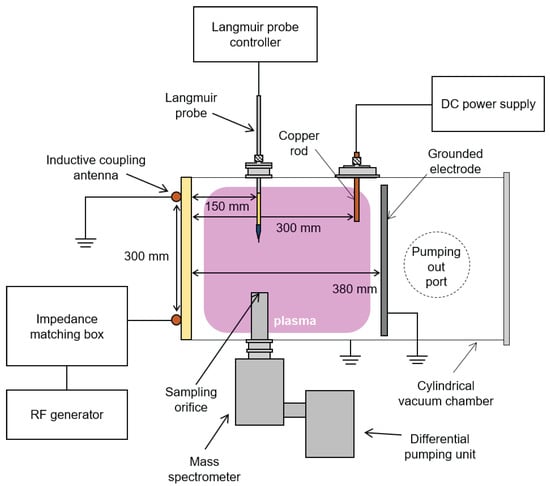 We employed an inductively coupled plasma (ICP) source, the details of which have been comprehensively described elsewhere [40]. In this section, we provide a brief overview of the system. Figure 1 illustrates a cross-sectional view of the ICP source. Ar and He gases are introduced into the vacuum chamber through mass flow controllers (MFC, LineTech Inc., Deajeon, Republic of Korea). The turbo-molecular pump (ATP400,Alcatel Vacuum Technology, France) and the rotary pump (DS102, Agilent Inc., Santa Clara, CA, USA) evacuate the vacuum chamber through the pumping port to maintain the desired chamber pressure, which is measured by the vacuum gauge (Baratron, MKS Instrument Inc., Andover, MA, USA). The radio-frequency (RF) generator (RFPG-600AI, RFPMT, Republic of Korea) supplies 13.56 MHz RF power to the inductively coupling antenna, which has a diameter of 300 mm, via the L-type impedance matching box, thus creating the plasma.