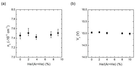 (a) Measured electron density and (b) plasma potential against He addition ratio (He/(Ar+He)) at a constant chamber pressure of 1.3 Pa (10 mTorr).