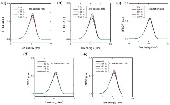 Figure 3a–e show the measured Ar IFEDF over ion energy for various He addition ratios, obtained through five trials. Here, multiple measurements were conducted to ensure measurement consistency due to signal degradation of the mass spectrometer over time (see the IFEDF values from Figure 3a–e). All IFEDFs exhibited a single-peak shape with a peak energy of 10.8 eV. With the exception of the first trial, their peaks consistently increased monotonically with increasing He addition ratio, while the peak energy remained constant. This indicates an increased number of ions near the peak energy, which can affect the . Figure 4 presents the averaged over the five trials as a function of the He addition ratio. The large discrepancy observed can be attributed to signal degradation of the mass spectrometer, as indicated in Figure 3. Nevertheless, it is evident that monotonically increased with the He addition ratio, except at the ratio of 9.09%. Notably, the increase in from the minimum to the maximum value in Figure 4 was approximately 7.5%. This increase was much larger than the perturbations observed in the plasma parameters shown in Figure 2, indicating that the increase in Ar ion flux on the substrate was primarily caused by the small fraction of He addition.