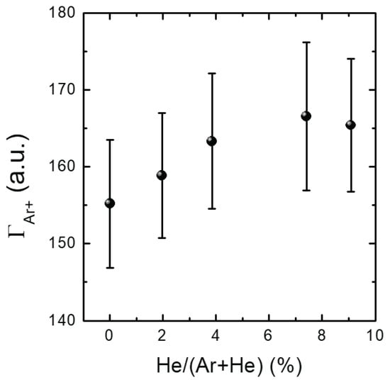 Ion flux () against additive He ratio at a constant chamber pressure of 1.3 Pa (10 mTorr).