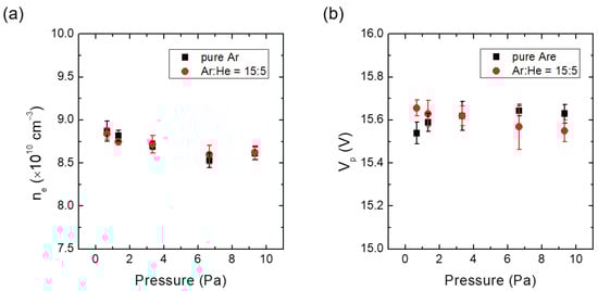 (a) Measured electron density and (b) plasma potential at pure Ar and fixed Ar/He ratio (Ar:He = 15:5) against chamber pressure.