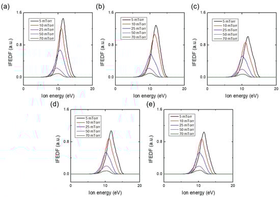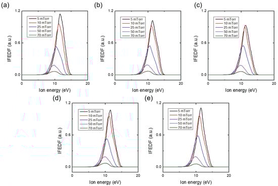 Ion flux–energy distribution function (IFEDF) with various chamber pressures with fixed Ar/He ratio (Ar:He = 15:5) at (a) 1st, (b) 2nd, (c) 3rd, (d) 4th, and (e) 5th trials. At the chamber pressure of 9.3 Pa, the pressure of the mass spectrometer is 5.2 × 10 Pa.