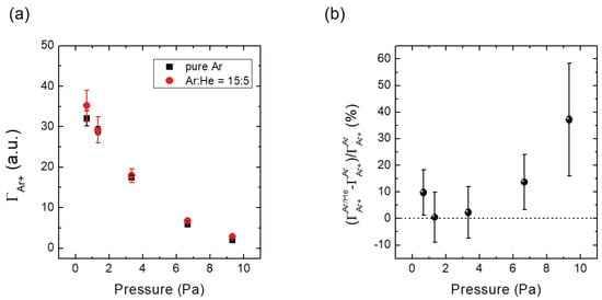 where is the target gas density and is the collision cross section. As the chamber pressure increases, the Ar gas density also increases. The mean free path for heterogeneous charge transfer and other collisions becomes shorter, while the sheath width (s) can be assumed to be constant due to the fixed and [14]. This implies that collisions become more frequent in the sheath () with increasing chamber pressure. Regarding the enhanced collision, the decrease in observed in the pure Ar environment, as shown in Figure 8a, may be due to elastic collisions between Ar ions and Ar atoms, which broaden the incident angle of ions and reduce the number of ions reaching the orifice entrance. In the Ar/He environment, the reduction trend follows that of the pure Ar case, but the reduction amount decreases, as shown in Figure 8a,b. In this environment, the two collisions, elastic collision and charge transfer collision, cause the decrease in the reduction amount. The homogeneous elastic collision between Ar atom and Ar ion diminishes due to the decrease in background Ar gas, but the heterogeneous collision between He atom and Ar ion compensates the decrease in the homogeneous elastic collision; since the elastic scattering cross section (Langevin cross section) has a root dependence for the mass of target gas, the heterogeneous collision cross section (He atom–Ar ion) would be similar to the homogeneous collision cross section (Ar atom–Ar ion). As a result, elastic collision effect slightly affects on ion transport in the sheath. Thus, the increase of in Ar/He case implies that heterogeneous charge transfer creates more Ar ions in the sheath with increasing chamber pressure. Therefore, the combined results suggest that heterogeneous charge transfer between Ar atoms and He ions enhances the Ar ion flux on the substrate.