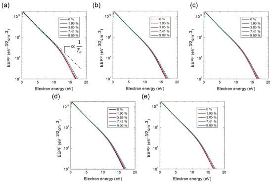 Electron energy probability function (EEPF) with various additive He ratio at chamber pressure of 1.3 Pa (10 mTorr) at (a) 1st, (b) 2nd, (c) 3rd, (d) 4th, and (e) 5th trials.