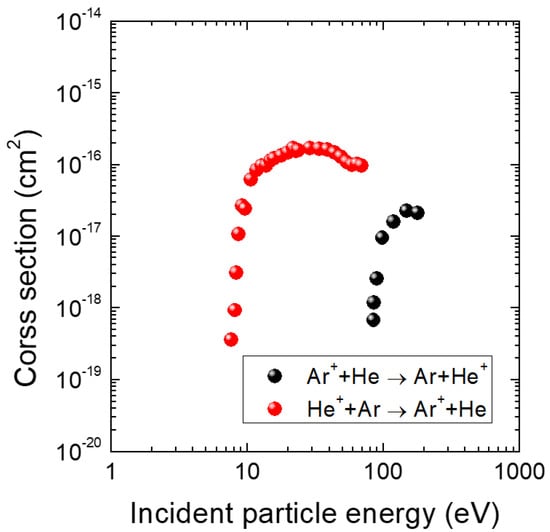 Figure 10 shows the cross sections of heterogeneous charge transfers [37,38] over incident particle energy. It is worth noting that the threshold energy and the maximum value for this collision are at the energies approximately 9 eV and 12 eV, respectively. Furthermore, the maximum value (∼10 cm) is comparable to electron-impact collisions, such as elastic scattering, excitation, and ionization, which are dominant in an inductively coupled plasma [14]. Conversely, the inverse process of heterogeneous charge transfer between an Ar ion and a He atom (Ar + He → Ar + He) has a significantly higher threshold energy, as shown in Figure 10. Considering the ion energy measured in the study (approximately 10 eV), the inverse process is unlikely to occur. Thus, the dominant collision mechanism responsible for creating Ar ions in the sheath is heterogeneous charge transfer between Ar atoms and He ions.