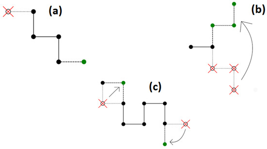 Figure 1. A scheme for modifying the conformation of a chain using the algorithms of: (a) reptation; (b) pivot; (c) Verdier–Stockmayer. Old positions of chain beads are marked by open circles and red crosses, while new positions are marked in green. - (ii)