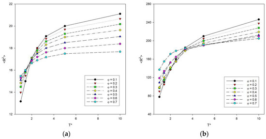 The dependence of the mean-squared radius of gyration <Rg2> on temperature T was also investigated, since this parameter is more accurate and precise than <R2>. This dependence is shown in Figure 3. It can be seen that the curves take a similar shape to the graphs of <R2>. As the temperature increases, the mean-squared radius of gyration of the polymer chains increases. In addition, the largest increase occurs between the transition from temperature T* = 1 to T* = 2. As with the previous graphs of <R2>, it was noted that the inflection point for long chains shifts toward higher temperatures compared to shorter chains.