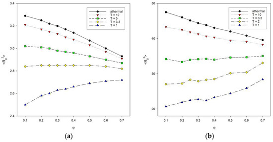 The ratio of the two size parameters discussed above is a good indicator of the effect of temperature [41]. Figure 4 shows a plot of the <Rg2>/<R2> ratio as a function of temperature for some polymer concentrations. As the temperature increases, this ratio decreases in all cases considered and no peak is seen, the presence of which would indicate some sort of transition. It can be concluded that as the temperature increases, the polymer coils become more packed finally reaching the state of a densely packed globule and the interactions between the chains decrease. The ratio <Rg2>/<R2> is lower for high temperatures and increases sharply at lower temperatures as the polymer chains collapse. For two-dimensional polymer systems with excluded volume, the value of this ratio predicted by the renormalization group theory is 0.133 [48], while without excluded volume, it takes the value of 0.167 [49]. Computer simulations of long chains on a square lattice have yielded a value for this ratio of 0.140 [50]. High temperature values presented in Figure 4 are considerably higher than these previous findings. However, it should be stressed that all of the values mentioned above (0.133 and 0.140) were predicted for a single chain, while there are no theoretical predictions for dense many-chain systems. The higher the polymer concentration, the higher the value of this ratio. Lowering the temperature leads to the increase in this ratio and to an increase in the difference between simulation results and predictions for a single chain, and interestingly, this increase is greatest for the most dilute solutions under consideration (φ = 0.1).