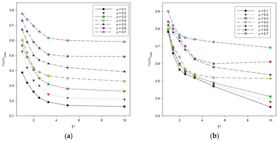Figure 5 shows plots of the mean-squared radius of gyration <Rg2> as a function of polymer concentration φ for different chain lengths with different temperatures. The athermal systems with T* = ∞ were included for comparison. The size of chains decreases with the increase in the polymer concentration (for T* = 2, the decrease is negligible) for athermal systems and at temperatures below the transition from coil to globule. For low temperature, the situation is reversed: as the concentration increases, lower <Rg2> values are seen. These trends are present for polymer systems consisting of shorter chains, i.e., for N = 10, 25 and 50. With long chains of N = 100, the size of the macromolecule increases with increasing polymer concentration. For higher temperatures (T* = 3.3 and athermal systems), a decrease in <Rg2> values can be seen because chains simply become compressed. In contrast, at lower temperatures (T* = 1, and 2), chain contraction is promoted by chain collapse due to segment–segment interactions, and on the other hand, some of these interactions are inter-chain and hinder the formation of compact disks. This is particularly evident for the low temperature T* = 1, where the increase in the polymer concentration leads to an increase in the average chain size. De Gennes scaling considerations for systems without an excluded volume lead to an inversely linear dependence of macromolecule size on the total polymer concentration <Rg2>~φ−1 [22]. In the case of our model, it can be noted that this relation does not work even for athermal systems where the dependency is close to linear. One has to remember that the introduction of the excluded volume has to change the scaling as well as polymer–polymer attractive interactions. Moreover, the total density used in the de Gennes formula is, therefore, different than that in clusters formed at low temperature by collapsed chains, where polymer density is considerably higher. We worked with dilute, semi-dilute, and at the onset of dense systems. The percolation point that can be roughly identified with the chain overlap point is located between cp = 0.50 and 0.34 for an athermal single chain consisting of N = 10 and 100 beads, respectively. The introduction of the temperature makes the percolation point independent of N: cp = 0.40 for T = 3.3 to 0.40 for T = 1 [52]. It should be remembered that at low temperatures, the density of the system is not uniform. One can try to estimate it by the local density, i.e., the ratio N/<Rg2> [53]. For the chain N = 100, one can discuss the behavior of local density, but the chain N = 10 is very short, and it is not exactly a coil or a disk, so considering local density does not really make sense here. The introduction of the attractive energy into the diluted system (φ = 0.1) increases N/<Rg2> significantly: from ca. 2.1 to ca. 4.9 for an athermal system and T* = 1, respectively. The other estimation of the polymer concentration in low-temperature clusters gives the value 0.91. Increasing the polymer concentration at higher temperatures interferes with the formation of discrete disks, and the local density increases. At low temperatures, the effect of concentration is exactly the opposite, i.e., the local density decreases.