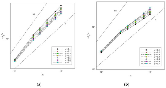 The next analysis concerned the dependence of chain size on chain length. Figure 8 shows the change in the mean-squared radius of gyration with chain length for different concentrations at two temperatures: T* = ∞ (athermal system) and T* = 1 (low temperature). The dependence of <Rg2> on N was shown on a log–log scale because scaling behavior of the type <Rg2>~N2ν was expected. Theoretical predictions for diluted (the exponent 3/2) and concentrated (the exponent 1) systems were also marked in this Figure. The behavior of the shortest chains deviates from the others, but it must be remembered that scaling laws were derived for infinitely long chains. After discarding the shortest ones, the others clearly satisfy the expected relationship. One can observe that for the lowest polymer concentration studied (φ = 0.1), the exponent is considerably lower than that for a diluted system. We also found that in the athermal system, the exponent 2ν decreases from 1.14 ± 0.01 to 1.01 ± 0.02 when the polymer concentration increases from 0.1 to 0.7, which was close to the value obtained for the same model but using a different sampling algorithm and at higher densities where 2ν was found between 1.08 and 1.1 [54], while off-lattice simulations gave the exponent between 1.51 and 1.07 [55]. This means that it reaches the value of 1 predicted theoretically for concentrated polymer melts [56]. This behavior is understandable, because when the polymer concentration increases, the chains begin to feel the presence of others, shrink and interpenetrate. In the low temperature system, the exponent behaves inversely, that is, it increases from 0.77 ± 0.02 to 0.93 ± 0.02 when the polymer concentration increases from 0.1 to 0.7. Note that several processes are taking place here at once. First, the chains must shrink with concentration, as in an athermal system. Second, attractive intra-chain interactions lead to collapse and the formation of densely packed disks (the size of such disks should scale like N1). Third, at higher densities, inter-chain interactions begin to have an impact, which interferes with the formation of compact disks.