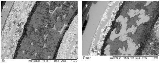 BSE images of cross-sections of outermost regions of cross-sections from samples B (a) and C (b) and at medium magnification of 100×. hFoV: 1.7 mm.