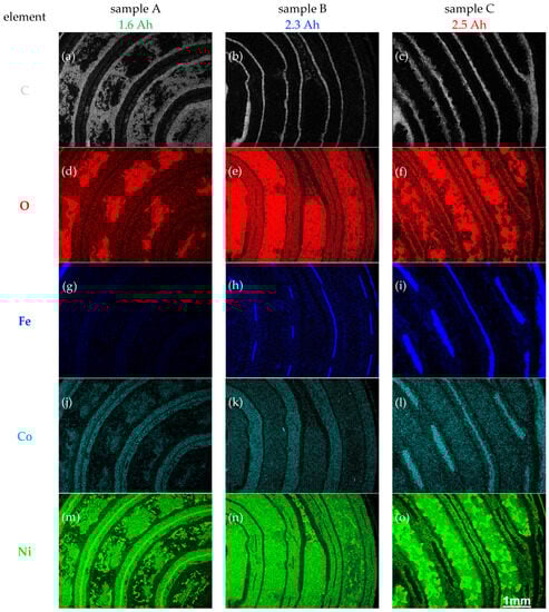 EDX maps of the major constituents from the same regions of each sample, including carbon, oxygen and the metals iron, cobalt and nickel. (a–o) Each element is shown in a different color in the rows; each column refers to a different sample. More maps from the same regions are shown in Figure 6. hFoV: 5.6 mm.