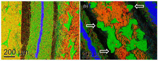 The cross-sections were mounted via sticky carbon tape onto aluminum specimen holders that were inserted into a Hitachi (Hitachi High-Tech Europe, Krefeld, Germany) 3030+ tabletop SEM equipped with a secondary electron (SE) detector, a segmented solid-state detector for back-scattered electrons (BSE) and a silicon drift detector (SDD) for energy-dispersive X-ray (EDX) spectroscopy. The SEM was operated at a 15 kV acceleration voltage and 8.3 mm working distance. The width of the interaction volume for the X-ray generation of 15 kV electrons within matter was of the order of about 1 µm for GaAs and was similar for many transition metals. The X-ray detector was a 30 mm2 Bruker X-Flash430 SDD (Bruker Nano Analytics, Berlin, Germany) mounted at a take-off angle of 22° and equipped with an AP3.3 ultra-thin polymer window (MOXTEK, Inc., Orem, UT, USA) [32]. Bruker’s Quantax70 software was used to acquire and analyze spectrum images that store complete X-ray data at 10 eV spectral resolution for each of the 640 × 480 data points. From these, spectra were extracted and chemical maps were generated so that no prior assumptions about the presence of possible chemical elements had to be made. This is important as the metal alloys used can be very complex and no element must be overlooked. The acquisition times were around 1 h for each of the spectrum images. The pixel sizes ranged from 9 µm at 30× (Figures 4 and 6) to 2 µm at 120× (Figure 5). Unfortunately, no fresh, i.e., uncycled, batteries from the same batches were available, and a comparison with more recent batches could be misleading.