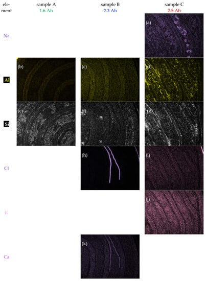 There is a weak O signal in samples A and B, where its even distribution along with the metals may just be due to the beginning surface oxidation that cannot be prevented after cross-sectioning in air; however, the O signal in sample C is much stronger and more indicative of surface corrosion of the negative electrode in the battery during service. This may be the result of the manufacturer’s choice to employ more cost-effective alloys (cf. above) and to include much more Al in the alloys of both electrodes. The correlation of Figure 4f and Figure 6d indicates that these factors have led to the formation of small alumina particulates.