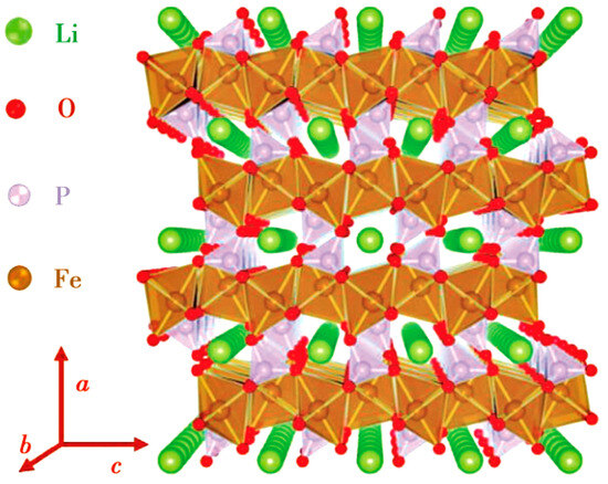 LFP has an olivine crystal structure [16], which transforms into the FePO4 (FP) phase during the charging process. Due to the similar crystal structure of the two phases, the volume change of the crystal cell before and after discharge is only 6.81%. Therefore, the internal stress formed in LFP is relatively small during the charging/discharging processes [17]. In addition, the P-O chemical bond is strongly stable, and thus the oxygen in the lattice is not easily lost. The stable crystal structure and very small internal stress make LFP extremely stable in terms of structure, with a cycle life reaching more than 2000 times the length and high safety [18]. Unfortunately, the Li+ diffusion coefficient and conductivity in LFP are very low due to two reasons: (1) in the LFP lattice (see Figure 1), electrons propagate through the transition metal layer, and each FePO4 is separated by an oxygen atom, with only one common vertex oxygen acting as the connection point. Therefore, LFP is almost an insulator, with an electron conductivity of only 10−9 s/cm; (2) the diffusion channel of Li+ is one-dimensional, and the PO4 tetrahedron hinders the diffusion of Li+ in the c-axis direction, which increases the diffusion resistance of Li+ between LFP and FP phases.