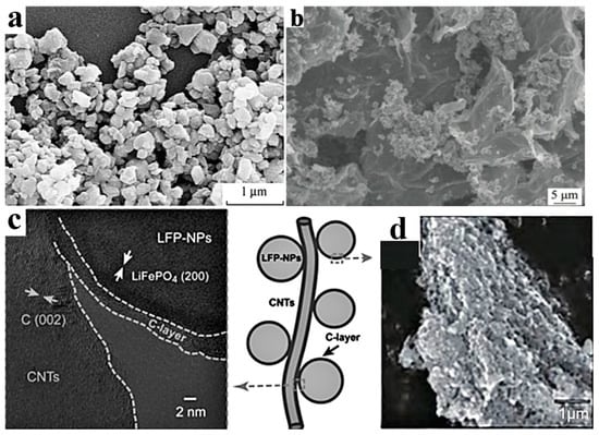 Carbon coating on LFP particles. (a) SEM morphology of LiFePO4/C [16], (b) SEM morphology of LiFePO4/activated carbon/graphene [22], (c) TEM morphology of LiFePO4/C/CNT structure [27], (d) SEM image of LiFePO4/graphite [16].