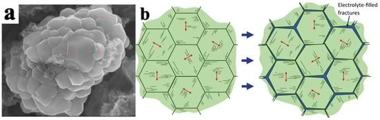 Particle morphology and cracks in LiNi0.5Mn0.3Co0.2O2 particles. (a) SEM morphology of LiNi0.5Mn0.3Co0.2O2 secondary and primary particles, (b) schematic diagram of the formation of intergranular cracks caused by anisotropic strain of layered primary particles within secondary particles. The arrows indicate the c-axis direction [30].